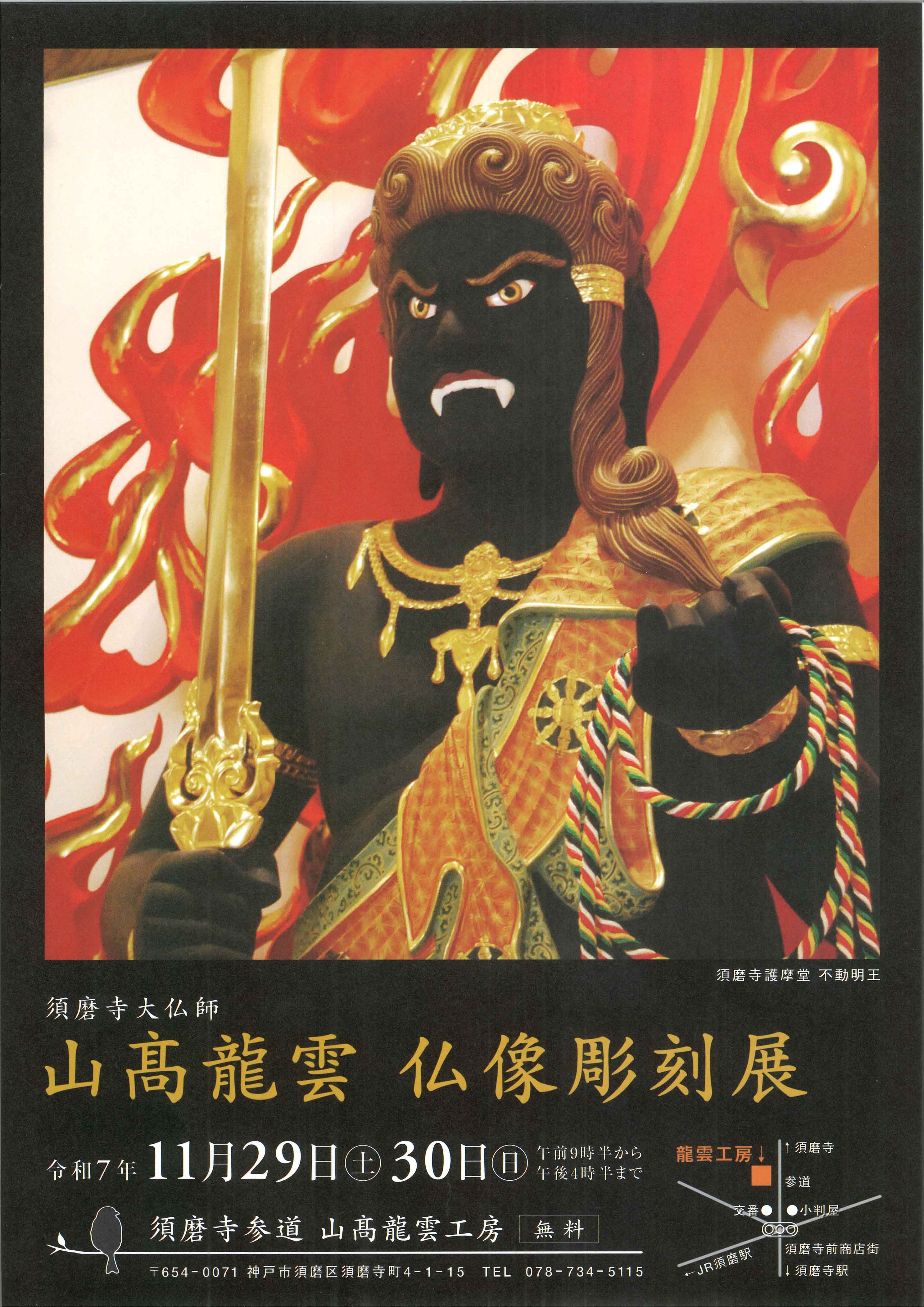 須磨寺大仏師 山髙龍雲 仏像彫刻展 日時 令和7年11月29日(土)・30日(日) 午前9時30分〜午後4時30分 会場 龍雲工房※須磨寺内ではなく「龍雲工房」での開催です。 入場料 無料 ご案内チラシ(クリックすると拡大表示します)